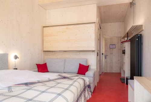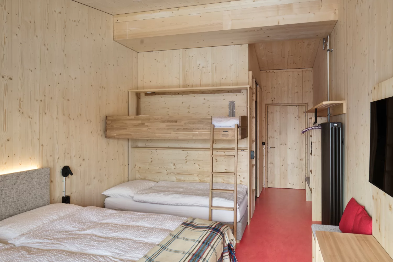 Bright room in spruce wood, 22m² area, 2 comfortable twin beds (90x200cm) and double folding bed with 1 to 2 beds (90x200cm) for children or adults, flat screen TV & WLan, balcony, lounge chair, modern bathroom.